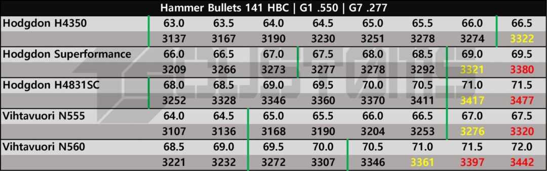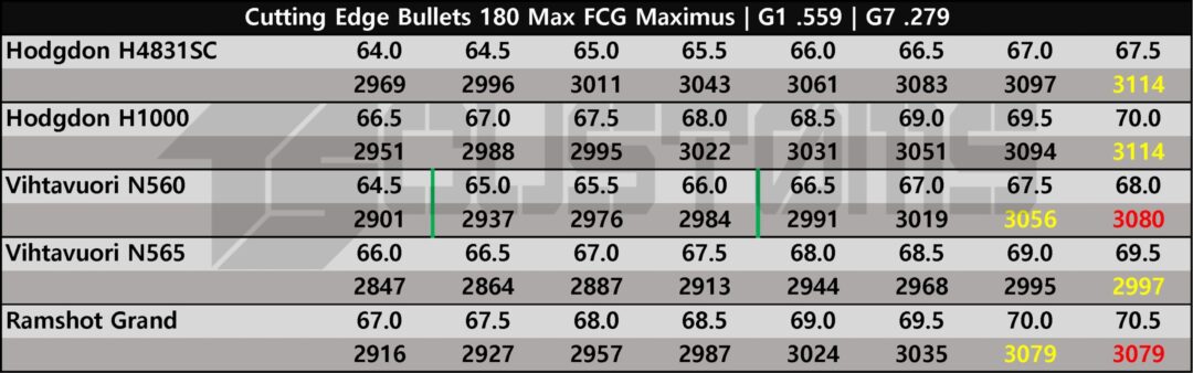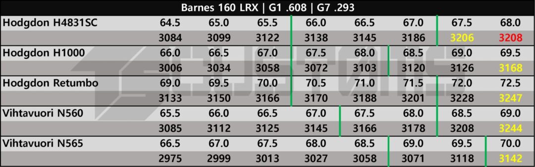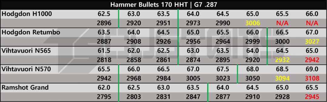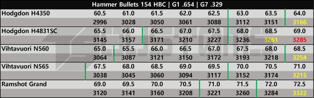 Retumbo and H1000 performed very well. If you’re running a longer barrel N570 shows a lot of promise as well just know you’ll most likely have a compressed load.