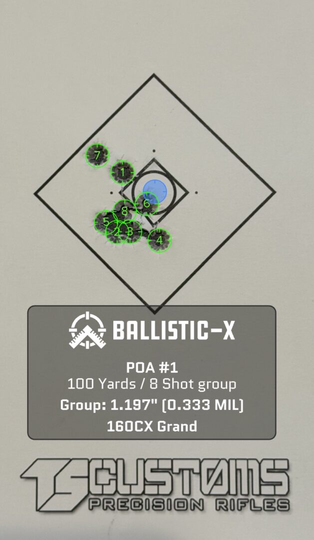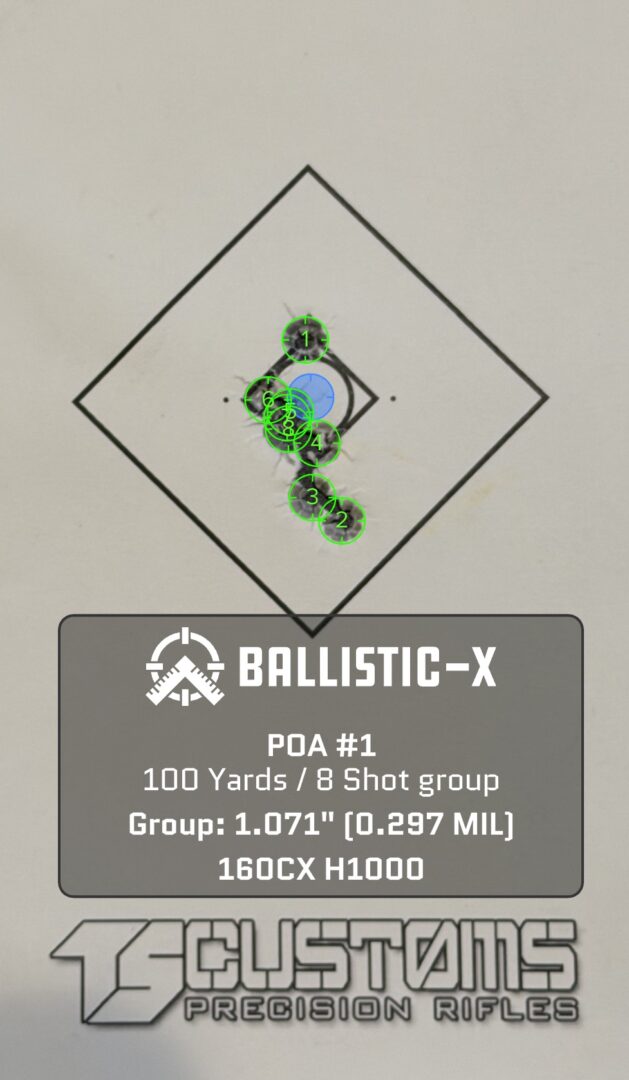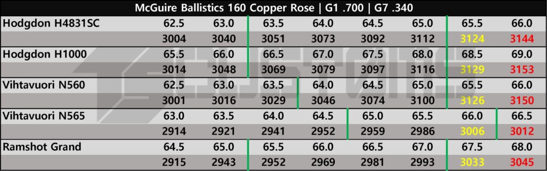I ran the 160 Copper Rose 0.030″ off the lands as well. H4831SC, H1000, Ramshot Grand, take your pick! I am extremely impressed with the performance of this bullet! It’s rare to get a bullet and powder combination that will shoot ladders under an inch, and this did well under an inch…TWICE. On a third powder combo ( H4831SC) they stacked a 5 shot group at 0.263″ with 63.5gr to 65.5gr of powder.