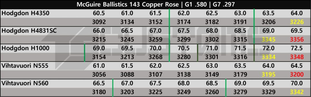 The 143 Copper Rose is an impressive bullet! It performed phenomenally with H4350, H4831SC, H1000, and N560. This would be a great bullet choice if you are running a very short barrel or need a ton of velocity.
